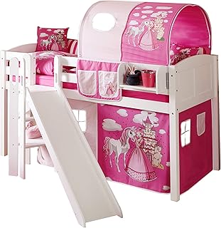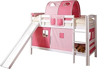 Hochbett mit Rutsche Rutschbett Manuel Kiefer massiv Weiss mit Farbauswahl, Vorhangstoff:Rosa Pink 3 teilig