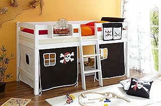 Hochbett Spielbett mit Schrägleiter Tipsi Buche massiv Weiss teilbar mit Farbauswahl, Vorhangstoff:Pirat Schwarz Weiss