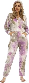 Damen Jumpsuit Tie Dye Teddy Fleece Einteiler Overall Anzug Flauschig Schlafanzug Plüsch Pyjama Mit Kapuzen und Reißverschluss Strampler Nachtwäsche Loungewear Hausanzug