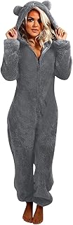 Damen Jumpsuit Winter Warm Kuschelig Einteiler Overall Frauen Teddy Fleece Pyjama Jumpsuits Ganzkörperanzug Hausanzug mit Kapuze Lang Schlafoverall Schlafanzug Cosplay Strampelanzug